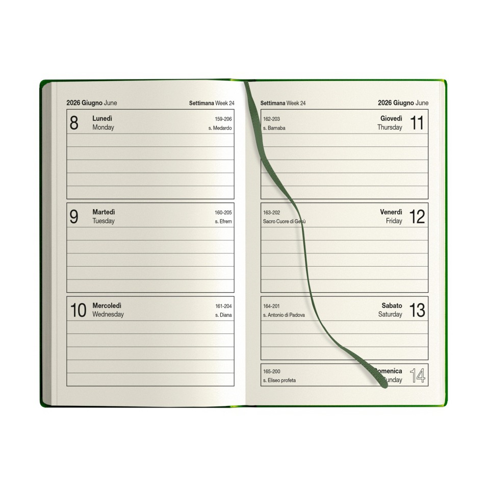 Interno settimanale in carta avorio stampato ad 1 colore. Segnapagine. Edizione multilingue (italiano/inlese). Inserti informativi.