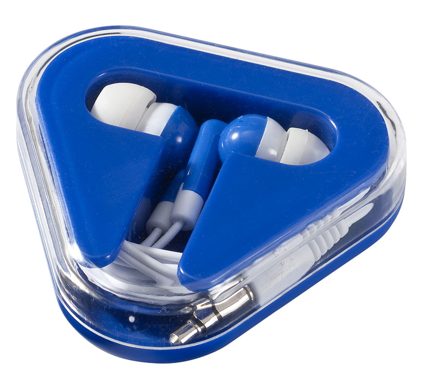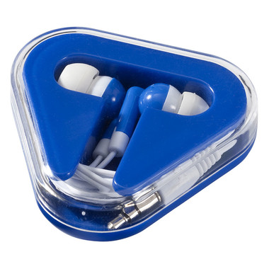 Auricolari colorati Abrax con custodia in plastica triangolare e spazio per riporre i cavi. Possono essere utilizzati con qualsiasi dispositivo audio standard con jack da 3,5 mm.