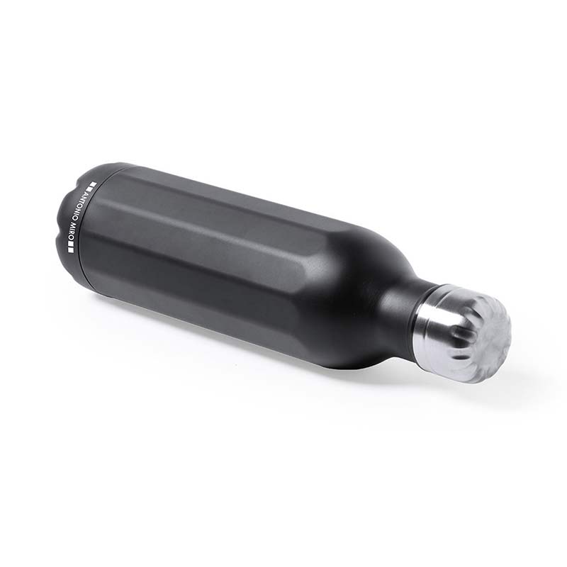 Borraccia in acciaio inossidabile Antonio Miró. Con una capacità di 750 ml e una sobria finitura nera satinata, con corpo a prisma e logo Mirò sulla base. Con tappo a vite cromat. Confezionata in una scatola dal design accattivante con il logo Mirò.