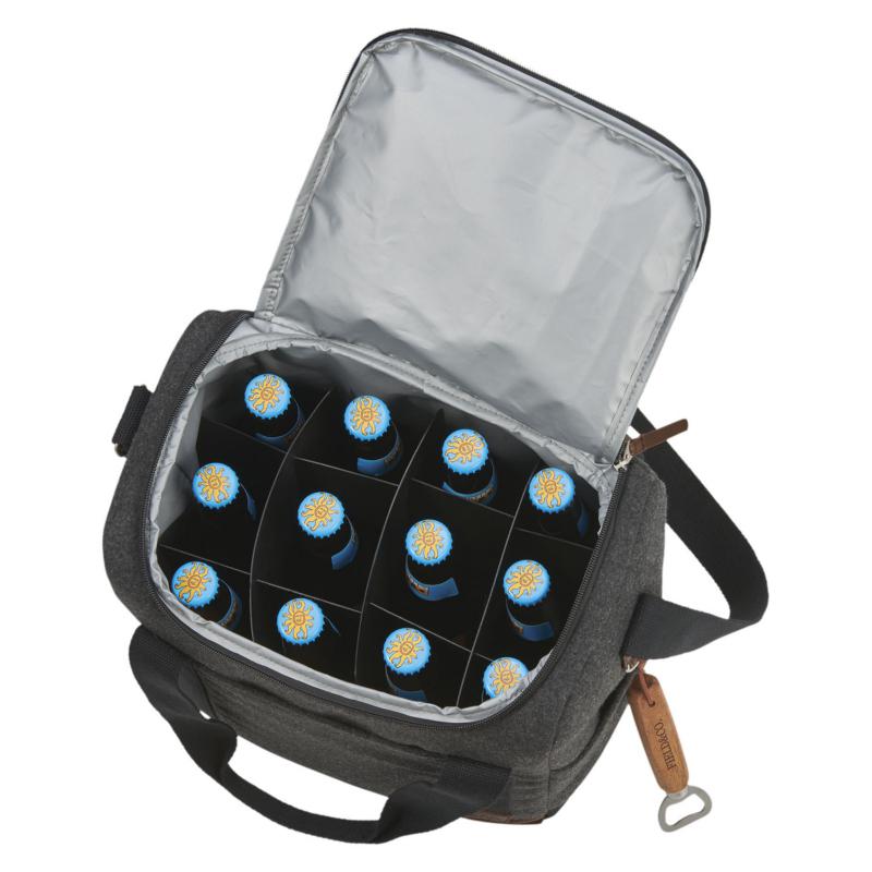 Questa borsa frigo dallo stile vintage, è composta da materiali in misto lana/poliestere combinati con dettagli in vinile per creare una borsa termica con divisore per bottiglie.