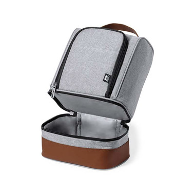 Borsa termica realizzata in resistente RPET 600D. Finitura grigia, base e maniglia di trasporto in similpelle marrone. Comprende 2 scomparti indipendenti, con chiusura a zip e manici in metallo. Interno isotermico in PEVA ed etichetta esterna con logo RPET.