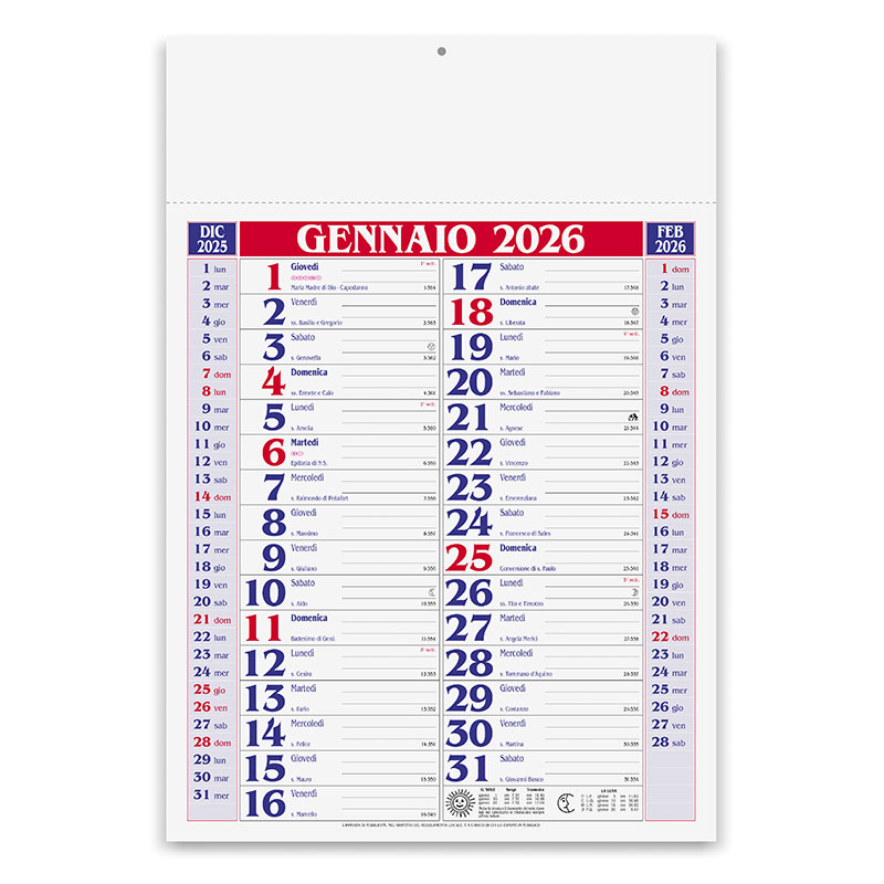 Mensile 12 fogli. Carta patinata 70gr. Testata termosaldata.