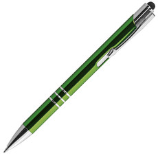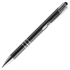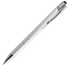 Penna a sfera in alluminio con finitura soft touch, meccanica a pulsante, minuteria cromata, grip intagliato.