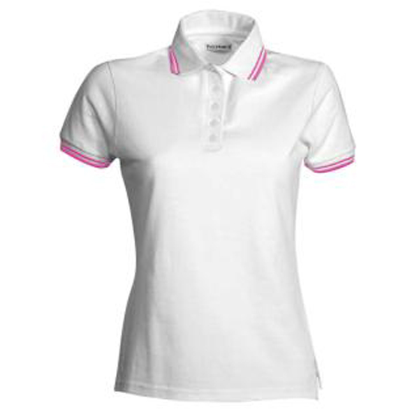 Polo donna sfiancata a manica corta a cinque bottoni bianchi, collo e bordo manica con fine profilo a contrasto fluo, bordo manica a costine, spacchetti laterali, cuciture del collo coperte, nastro di rinforzo laterale.