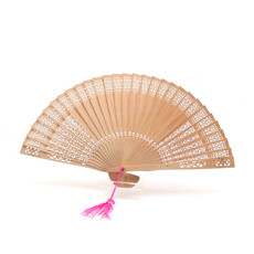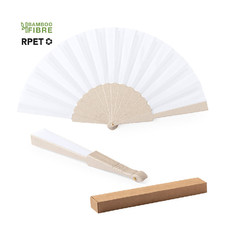 Ventilatore della linea Nature, con aste in fibra di bambù e tessuto RPET, realizzato in plastica riciclata, al fine di promuovere il riutilizzo dei rifiuti di plastica e aiutare la sostenibilità del pianeta. Presentato in una confezione individuale eco design.